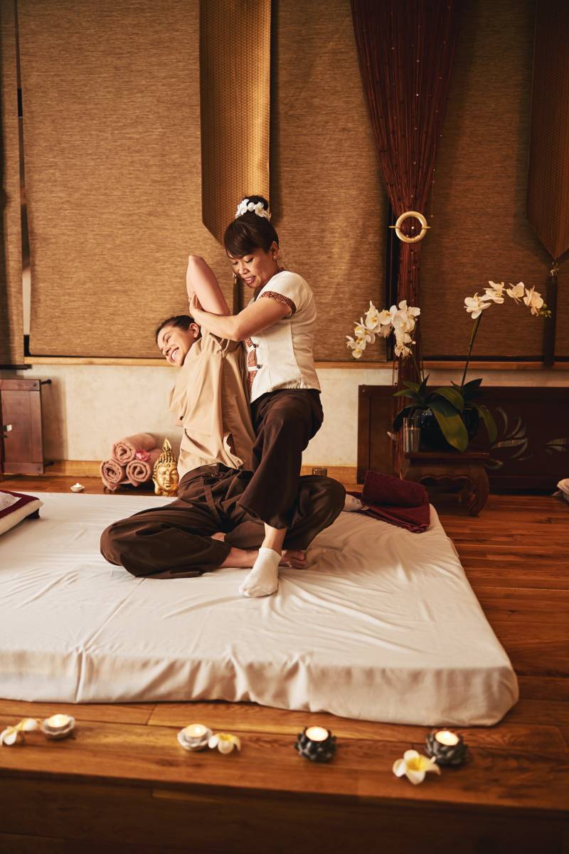 Le massage traditionnel thaï est un massage énergétique et tonifiant qui se pratique en tenue traditionnelle, sans huile avec la paume des mains, les coudes, les genoux et les pieds en une série de pressions et d’étirements afin de rétablir l’équilibre énergétique du corps.