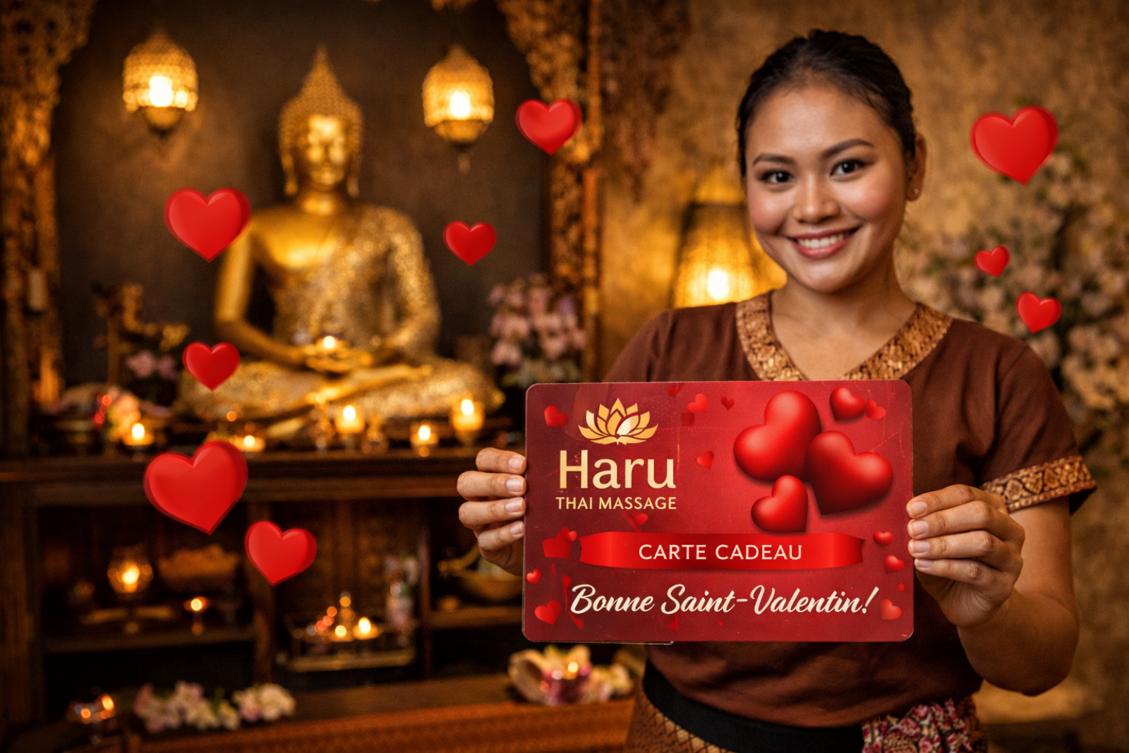 Pour la Saint-Valentin, surprenez la personne que vous aimez avec un cadeau original, raffiné et profondément relaxant : une carte cadeau solo ou duo pour un massage thaïlandais authentique chez Haru Thai Massage, à La Teste et Arcachon.
